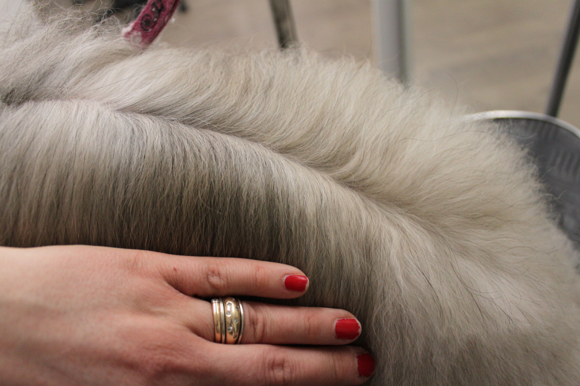 - Kuivaa koira föönin ja karstan/harjan kanssa käymällä karva jakauksittain läpi ja puhalla karva suoraksi tyvestä asti.